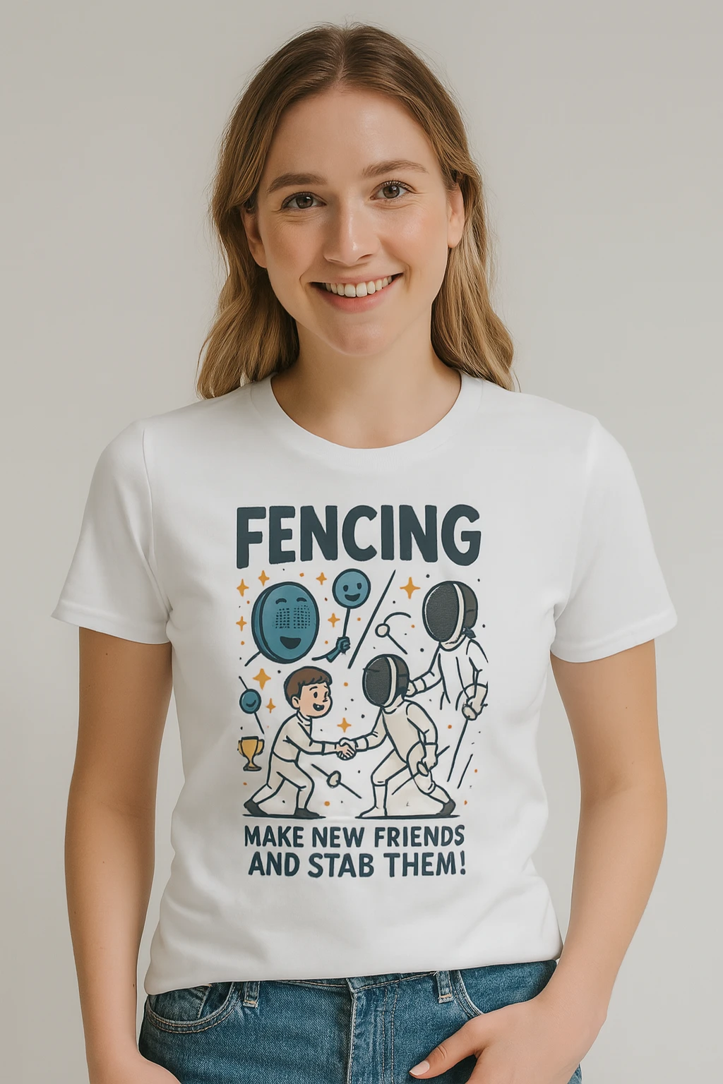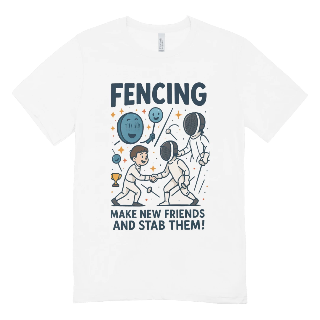 Le slogan hilarant « Fencing: Make New Friends and Stab Them! » apporte une touche décalée qui fera sourire tous vos partenaires de club.